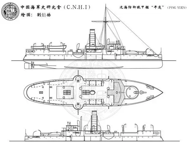 Los cruceros acorazados Zhiyuan, Jiyuan (se llama Jingyuan, pero lo escribo así para no confundirlo con el Jingyuan, de fabricación alemana; el chino es una lengua tonal, por lo que es difícil transmitir el nombre correctamente) y Chingyuan, construido en Elswick por Armstrong & Mitchell, son cruceros acorazados típicos de Elswick: desplazamiento de 2.310 toneladas, tres cañones de 210 mm, dos en proa y uno en popa, protegidos por escudos blindados, dos cañones de seis pulgadas a los lados, ocho cañones Hotchkiss de 57 mm y seis metralleras Gatling de 37 mm, cubierta blindada de 50 mm, taludes de 100 mm, escudos de cañones de 51 mm y una torre de mando de 76 mm.